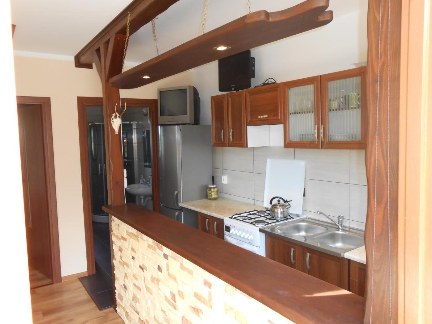 Dom wakacyjny. This holiday home features 3 bedrooms, kitchen and 1 bathroom with a walk-in shower. The holiday homes kitchen, which has a refrigerator, is available for cooking and storing food. This holiday home features a barbecue, a flat-screen TV and an outdoor dining area. The unit has 5 beds. Dom wakacyjny - 5 osobowy. Powierzchnia pokoju ok.: 50 mkw.