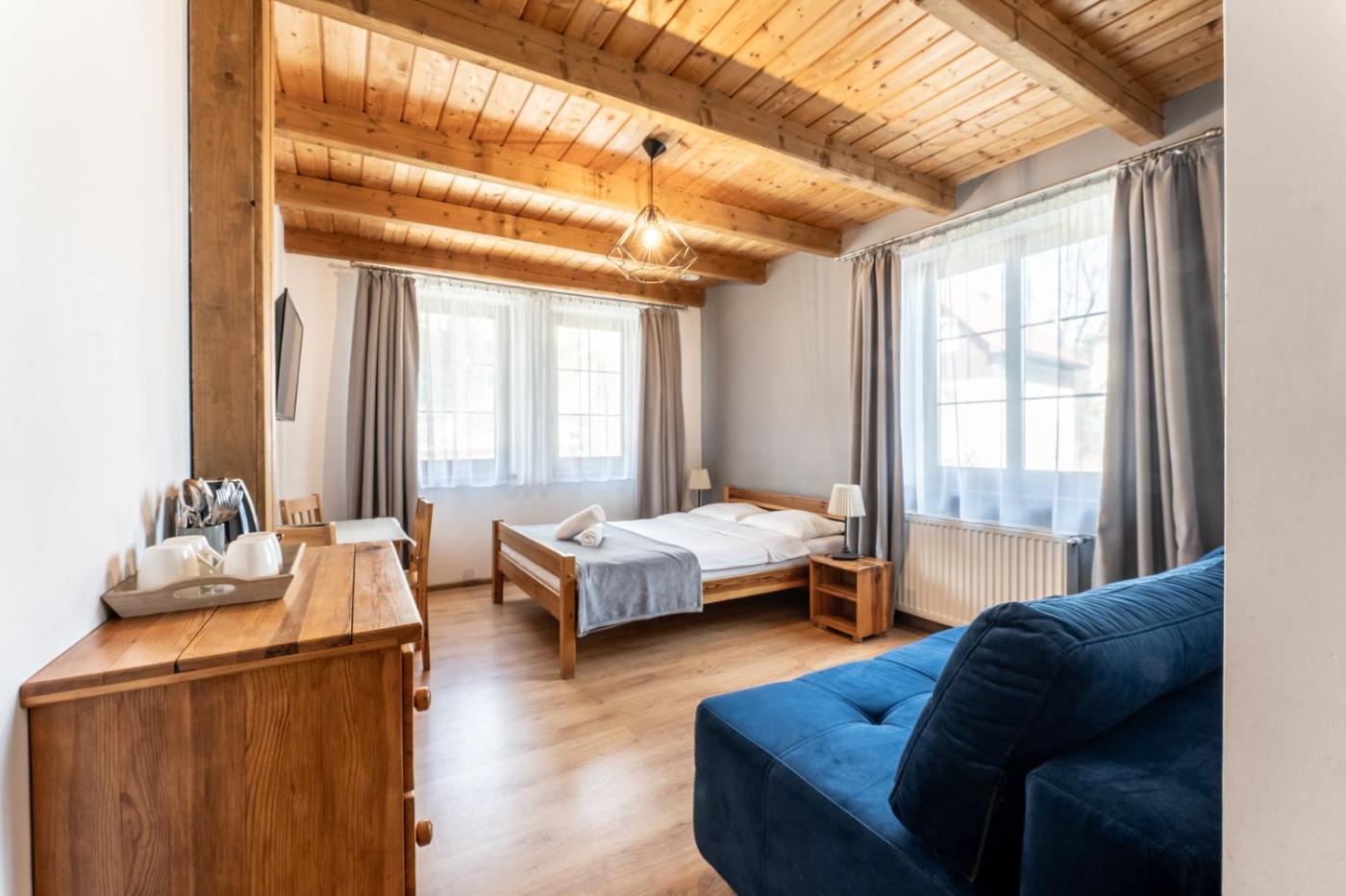 Pokój Czteroosobowy. The quadruple room provides a wardrobe, an electric kettle, as well as a private bathroom featuring a walk-in shower. The quadruple room features a flat-screen TV, a barbecue, a sofa, parquet floors as well as garden views. Pokój Czteroosobowy - 4 osobowy. Powierzchnia pokoju ok.: 17 mkw. ;